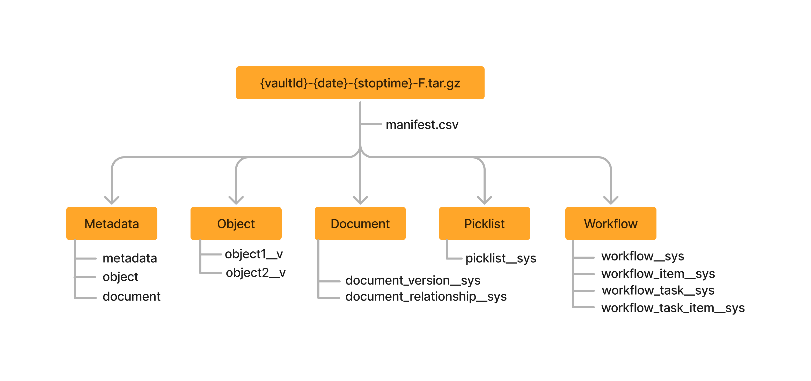 vaultid: Refers to the Vault’s IDdate: Refers to the date that the file was created (in YYYYMMDD format)stop_time: Refers to the stop time in UTC of the interval (in HHMM format)type: Refers to the type of the file (N: Incremental, F: Full, L: Log)filepart: Refers to the part number of the file. Files greater than 1 GB in size are split into parts to keep downloads manageable (in NNN format). Learn more about working with file parts.For example, 143462-20240123-0000-F.tar.gzip.001 indicates the first file part of a Full Direct Data file from a Vault with ID 143462 that contains data from the time the Vault was created to January 23, 2024, 00:00 UTC.